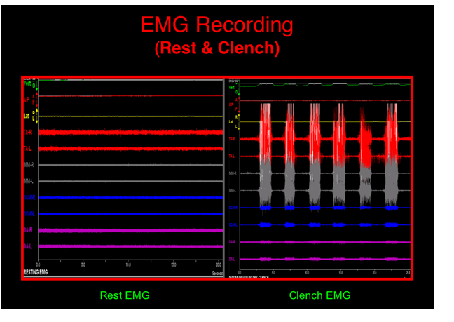 Electromyography (EMG) recording of the craniomandibular muscles before, during and after placement of an intra-oral orthotic is used to verify a patient's complaint of muscle strain. The EMG recording below (lower left) depicts raw data of a patient during jaw "rest" (teeth slightly apart). The EMG recording (lower right) shows raw data of the patient's clenching (clench, release, clench, release..)