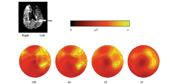 This 80-year-old woman was found slumped in her chair in her assisted living home. The diffusion-weighted MRI performed 2.5 hours after admission showed an ischemic region in the left hemisphere (all images in this frame are left on the right for comparison). The 128 channel EEG recorded 3.5 hours after admission (leftmost) showed focal delta and theta (the maps here show the amplitude in the 1 to 3 Hz or delta band.) Courtesy of EGI.
