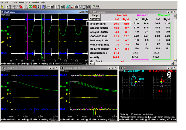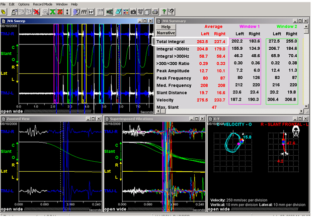Joint sounds (also called vibrations) may emanate from the right and/or left temporomandibular joints and are measured in integrals. An integral is the amount of energy in a vibration. Table 1 depicts the total integral measured during a recording of 263.5 integral in the left TMJ and 237.4 integral in the right TMJ.